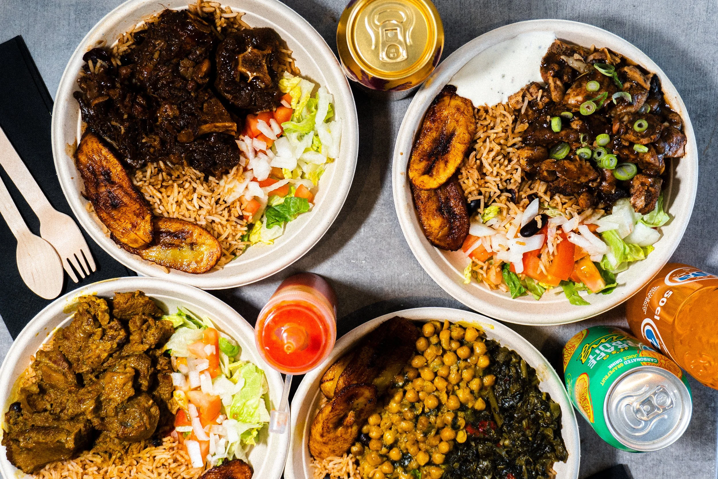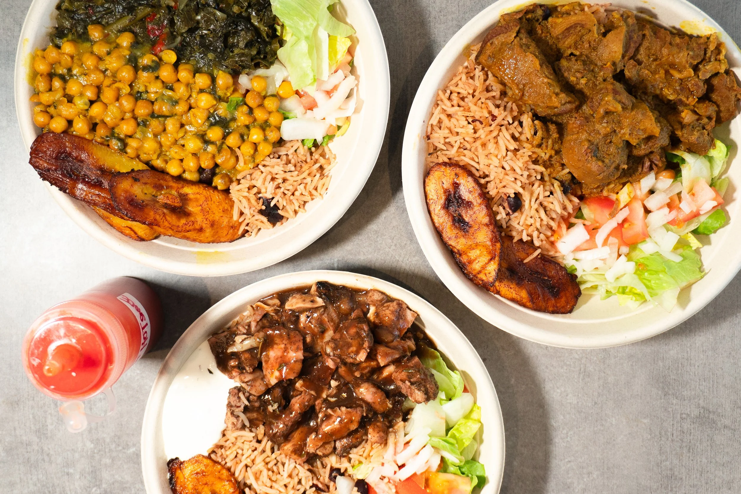 a top down picture of 3 of hoodwoods rice bowls top left is carlita veg trio on the right is curried lamb, plantain, rice and peas and a side of salad. and the bottom is a oak smoked jerk chicken bowl and in the middle is a hot sauce bottle.