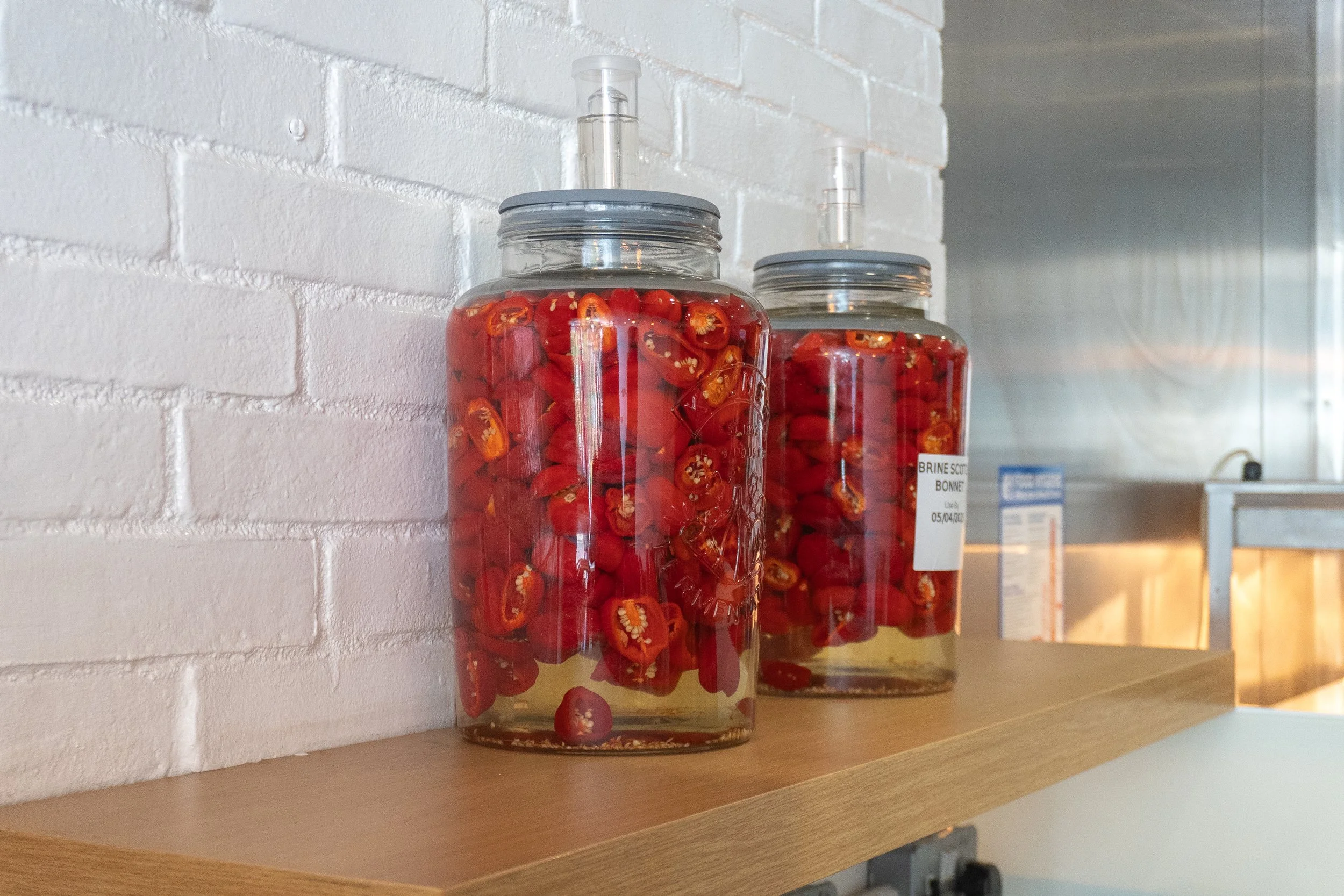 Two jars of lacto fermenting scotch bonnets on a desk which have been brined for a week bright and vibrant chillis for hoodwoods juju sauce