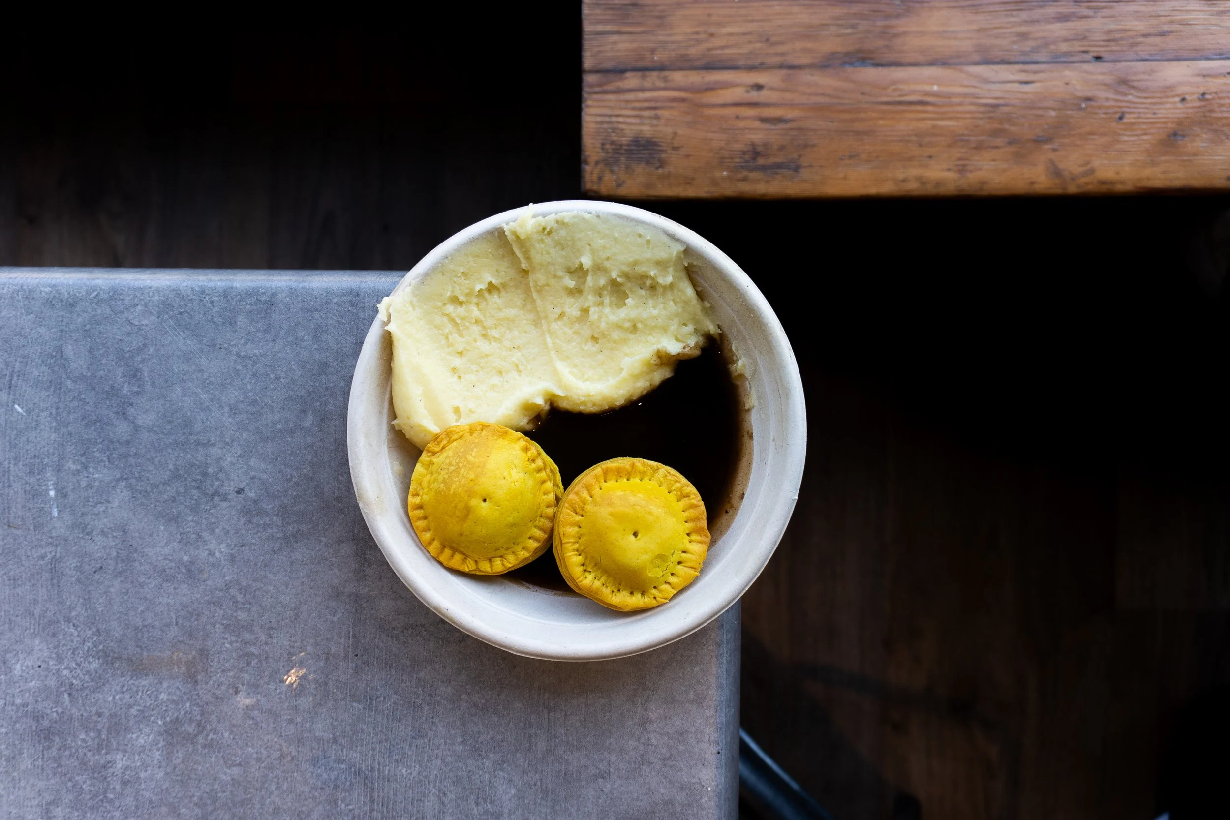 a top down shot of hoodwoods 2 patty pies, mash potato and jerk gravy