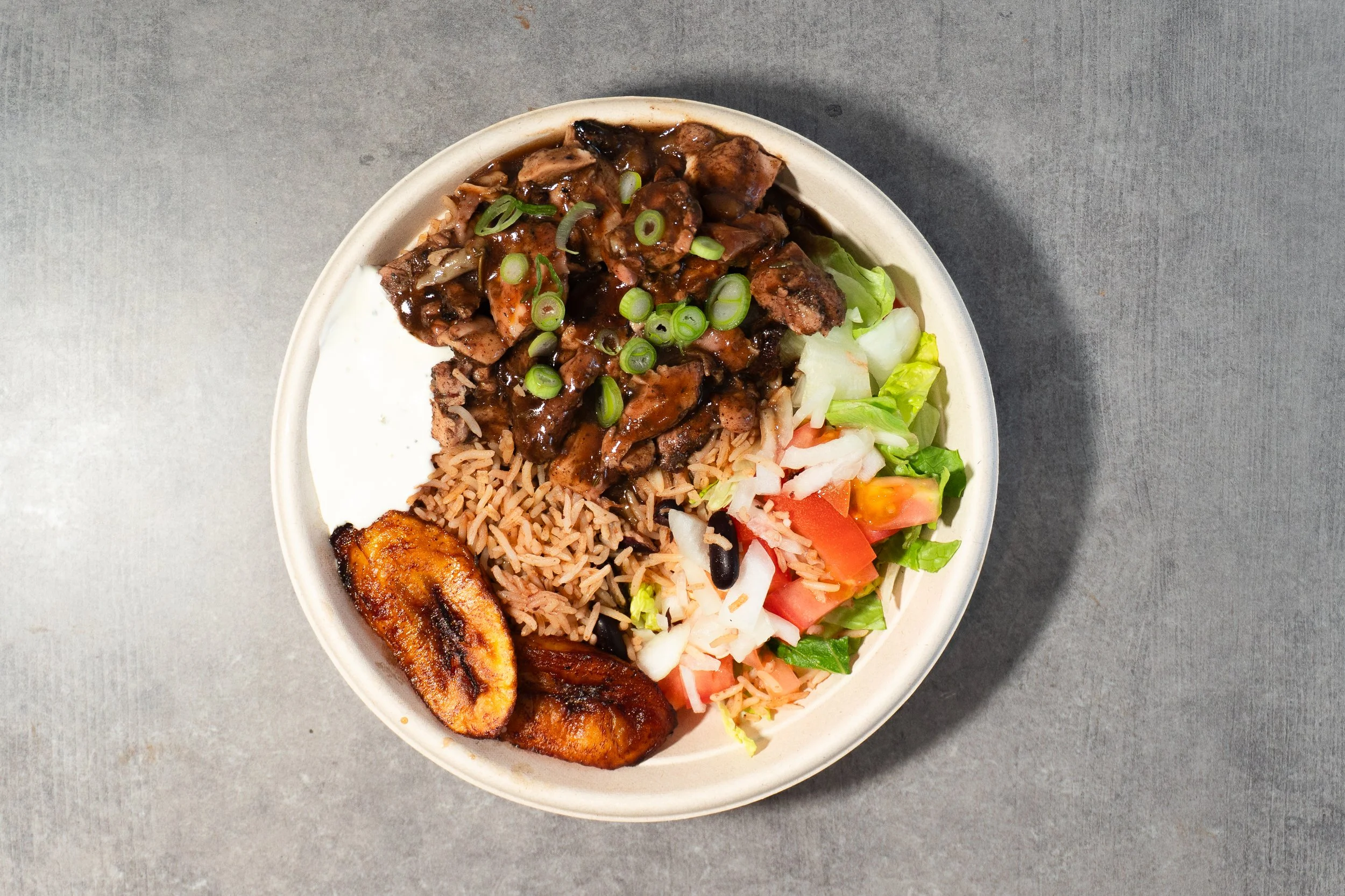 a top down shot of hoodwoods rice bowl with oak smoked jerk chicken, plantain, rice and peas and a side of salad.