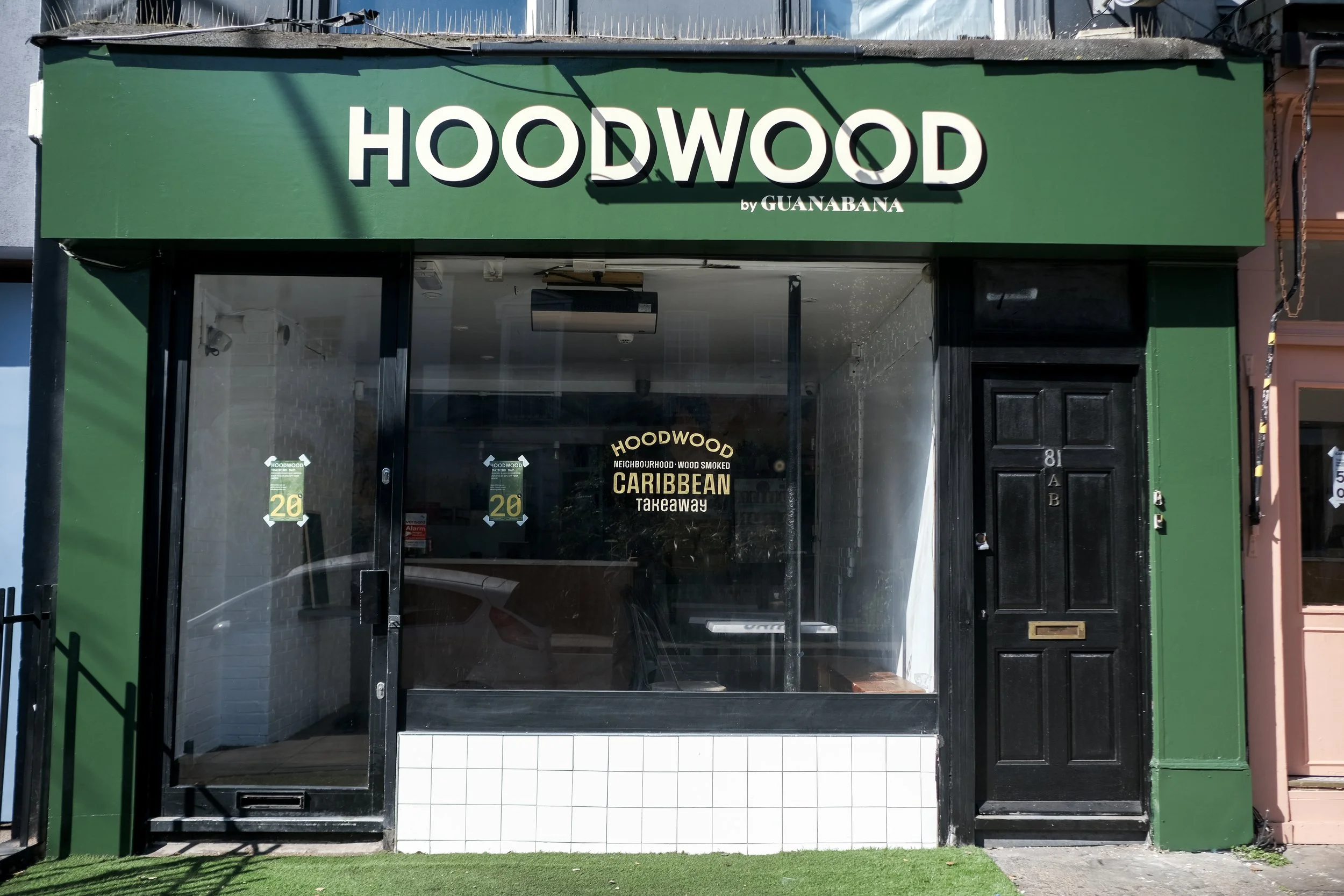 The front of a green shop named hoodwood which has a painted sign on the window that says hoodwood neighbourhood Caribbean takeaway